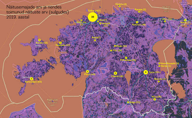 2019. aastal toimus kokku 966 kunstinäitust, mis on mõnevõrra rohkem kui 2018. aastal. Peaaegu pooled neist toimusid Tallinnas (417 näitust, 39 näitusemaja), teisel kohal oli Tartu (151 näitust, 8 näitusemaja) ja kolmandal kohal Kuressaare kus toimus kokku 63 näitust (5 näitusemaja).