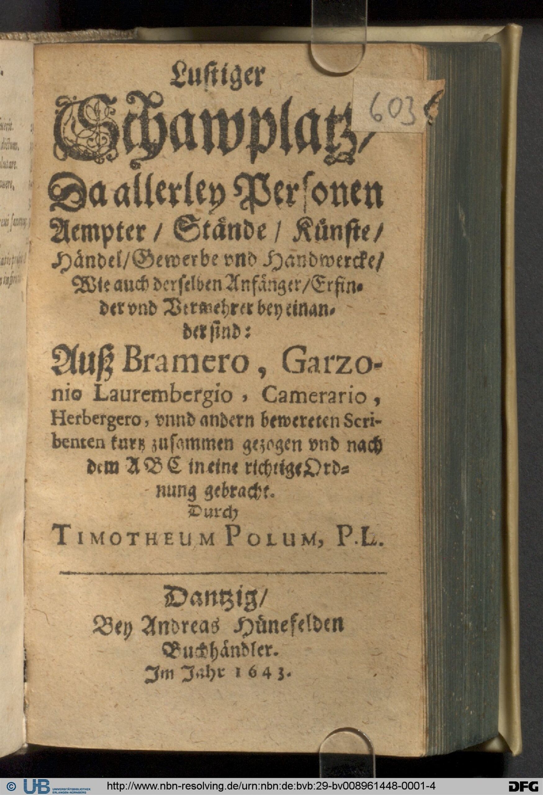 Timotheus Poluse „Lõbusa vaatelava“ Gdańskis (Danzigis) välja antud kordus­trükk 1643. aastast, mis asub Erlangen-Nürnbergi Friedrich-Alexanderi Ülikooli raamatukogus.