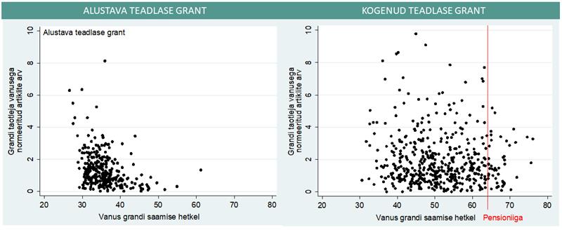 Joonis näitab, milline on alustava ja kogenud teadlase grandi saajate vanuseline jaotus. Lisatud riikliku pensioniea punane joon illustreerib hästi Eesti teadussüsteemi vananemist.