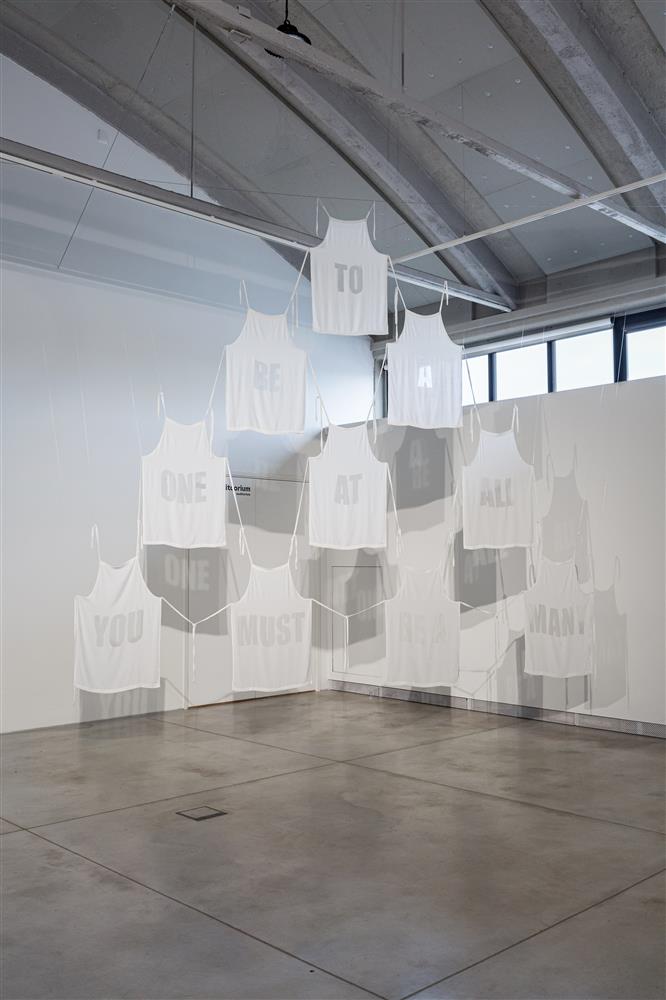 Kõige selgemat sotsiaalset sõnumit kannab tekstiilikunstnik Sandra Kosorotova installatsioon. Püramiidina rippuvate särkide rinnapealsetest on loosunglikult lõigatud välja sõnad. Neid kokku veerides saab lause „Et üldse olla, on vaja paljusid“. Aamen.