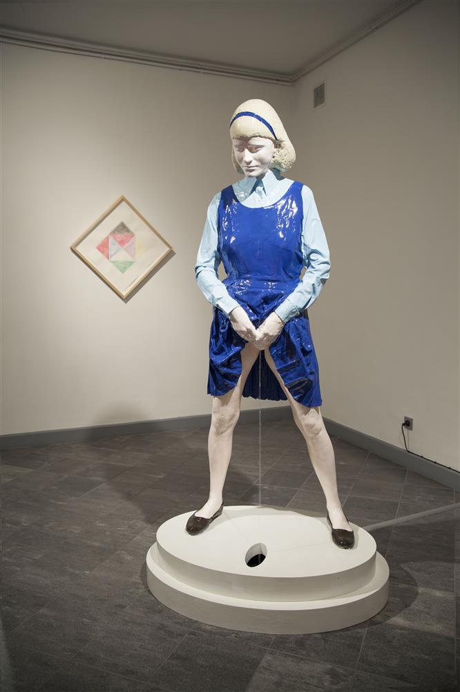 Et mitte hakata promiskuiteetselt amokki jooksma, otsustasin eelmängu korras konsulteerida esimese saali seinale kirjutatud sissejuhatusega. See oli viga, sest teksti suuresõnaline pateetilisus („inimõigused“, „fallotsentristlik mentaliteet“, „meestekeskne maailmapilt“ vms) ähvardas korraga sütitada rahuldamatu kunstilise ootuse ning lämmatada kiimase kunstisõbra väiksemagi kiresädeme. Nendest dissonantsidest vabanemiseks keerasin pea vaistlikult 180 kraadi paremale2 – ja mida ma nägin: minu ees, üsna saali keskel, seisab seelikuäärt ülal hoidev urineeriv skulpturaalne kujutis. Esmalt tundus „Juga“ (2016) kehastavat Duane Hansoni hüperrealismi vaimus nõukogudeaegses koolivormis tütarlast, kuid see suhteliselt väikse libiidopotentsiaaliga tõlgendusfaas möödus õnneks ruttu. Mõistagi piidlesin korraliku isasena installatsiooni eriti tähelepanelikult just altpoolt. Kuna preilna intiimpiirkond oli ehk liiga abstraktne, pidin parema tulemuse (nn domina-efekti) saavutamiseks end põlvele laskma. Justkui boonusena voogasid siis mu teadvusse erutuslained: watersport, golden shower, toilet. Kuigi „Juga“ pakub head lähtematerjali mannekeeni- ja kujufetišistide tarbeks (agalmatofiilid), rääkimata kostüümi- või univormi-armastajatest, siis minu puhul need lingid ei avanenud. Küll aga aktiveerus rida paralleele muust kunstimaailmast, kuigi, nagu aimata võid, mitte kunstilistel põhjustel, vaid seksuaalse atraktiivsuse tõttu. Tõdesin, et Treumund trumpaks üle Helen Chadwicki („Piss Flowers“, 1991-1992), jääks viiki sellise konservatiivse kükitajaga, nagu on Cathy Akers („Pee Performances“, 2005-2006), ja kaotaks ilmselt Sophie Rickettile („Pissing Woman“, 1995).