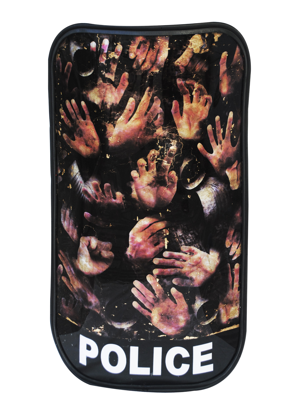 Rõhk on kilbi pildil, millega kunstnik soovib näidata tõde, mida kilbiselg varjab. Esiküljed on aga kui aknad, mis näitavad reaalsust müüride taga, kaitsmaks poliitikuid, rõhujaid ja ahneid inimesi. Massirahutused tekivad inimeste soovist võidelda oma õiguste eest – see on aga hetk, mil nad põrkuvad vastu kilbimüüri.