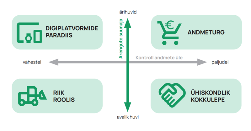 | Ettevõtte roll | Koostööpartner suurtele digiplatvormidele, passiivne andmetarbija oma vajaduste osas | Andmetega kaupleja, andmetest väärtuse looja | Osaline andmete ökosüsteemi loomisel ja aktiivne andmetarbija | Riigilt andmekasutusloa saaja ja riiklike tellimuste täitja |