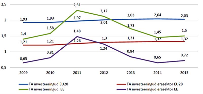 Teadus- ja arendustegevuse investeeringute tase 3% SKTst on ühtlasi Euroopa Liidu eesmärk, mis lepiti kokku Euroopa kasvustrateegias.4 Ja nii nagu Eesti, ei ole ka EL tervikuna ega enamik liikmesriike eraldivõetuna suutnud seda saavutada – teaduse ja innovatsiooni rahastamine moodustab 2,03% euroliidu SKTst ning 3%-ni on jõudnud ainult Austria, Rootsi, Soome ja Taani. Euroopa Liidus 2020. aastani teadusuuringute ja innovatsiooni rahastamise aluseks olev raamprogramm „Horisont 2020“ mahus 75 miljardit eurot on küll maailma suurim, kuid mitte piisav globaalses konkurentsis püsimiseks. Kui „Horisont“ loodi, siis öeldi, et absoluutne miinimum seatud eesmärkide saavutamiseks on 80 miljardit eurot. Seda ei ole paraku saavutatud ning „Horisonti“ on mitu korda kärbitud.