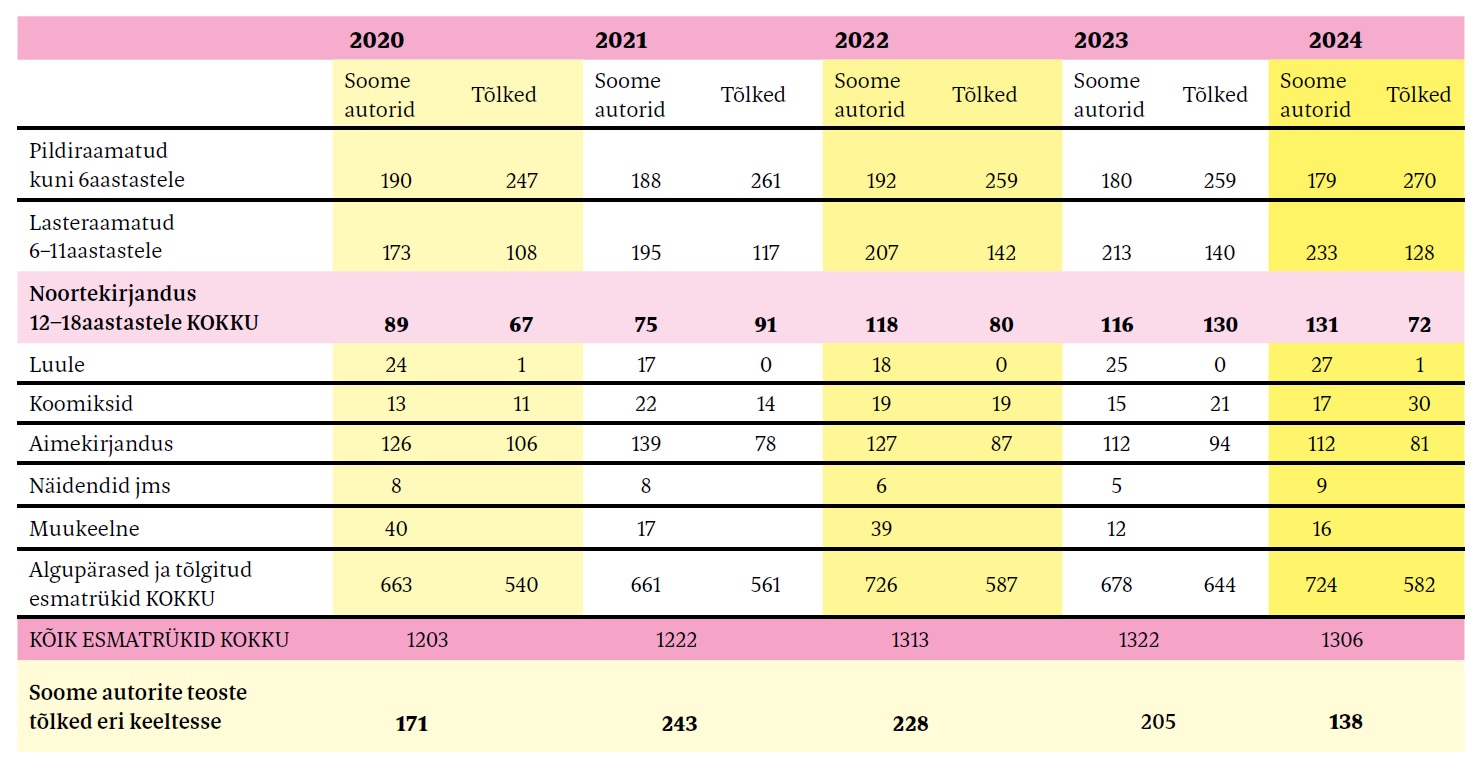 Sel taustal paistabki märgiline noortekirjanduse käekäik Soomes: 2022. ja 2024. aastal noortekirjanduse tõlgete osakaal langes, sealsete autorite teoste arv seevastu tõusis. 2024. aastal ilmus seal algupärast noorte ilukirjandust peaaegu kaks korda enam kui tõlkeid (vt tabel 1).