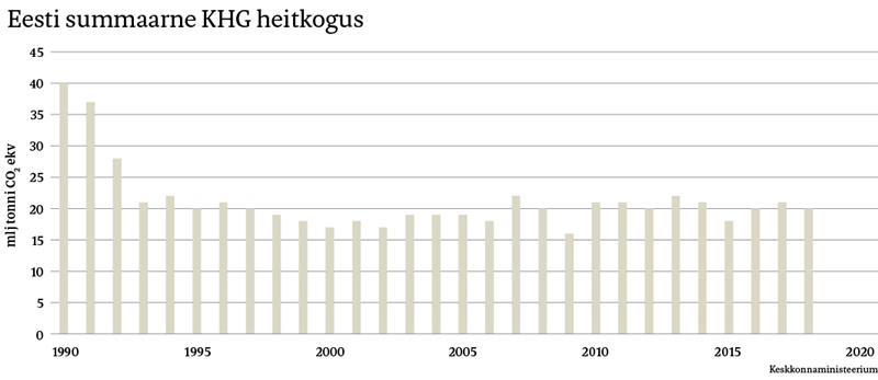 Kuni koroonapuhangu alguseni armastas peaminister, nagu ka tema kolleegid ja näiteks riigiettevõtte Eesti Energia juhid, korrata ja korrata, et Eesti on teinud teistest palju rohkem jõupingutusi kasvuhoonegaaside vähendamisel ning baasaastaga võrreldes on vähenemine olnud 55–70% ning sellega on endale võetud kohustused täidetud. Formaalselt võib nii ollagi ja Eesti Energia on turu sunnil tõesti pidanud oma põlevkivijaamad tihti välja lülitama, aga valitsuse tasandil on selle protsendi imetlemine suur ja kaua kestnud, valitsuselt valitsusele pärandunud enesepettus. Enesele jäetakse mulje, nagu oleks süsinikuheidete vähenemine saavutatud valitsuste pikaajaliste jõupingutuste tagajärjel.