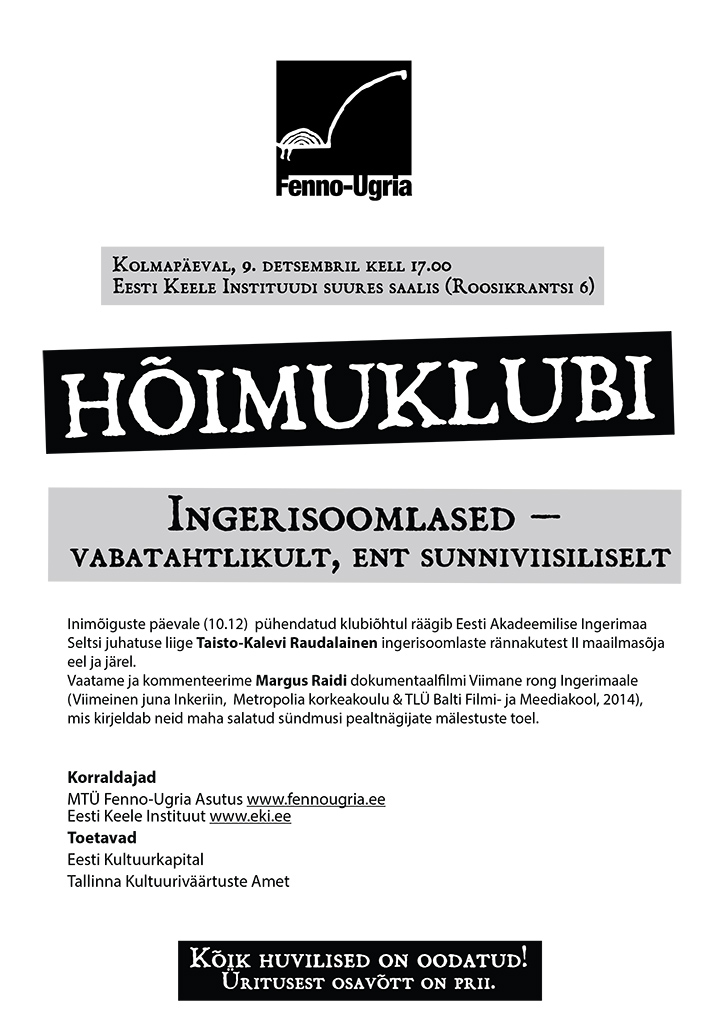 MTÜ Fenno-Ugria Asutus korraldab kolmapäeval, 9.detsembril kell 17.00 Eesti Keele Instituudis hõimuklubi „Ingerisoomlased – vabatahtlikult, ent sunniviisiliselt“, mis on pühendatud Inimõiguste päevale (10.12). Klubiõhtul räägib Eesti Akadeemilise Ingerimaa Seltsi juhatuse liige Taisto-Kalevi Raudalainen ingerisoomlaste rännakutest II maailmasõja eel ja järel.