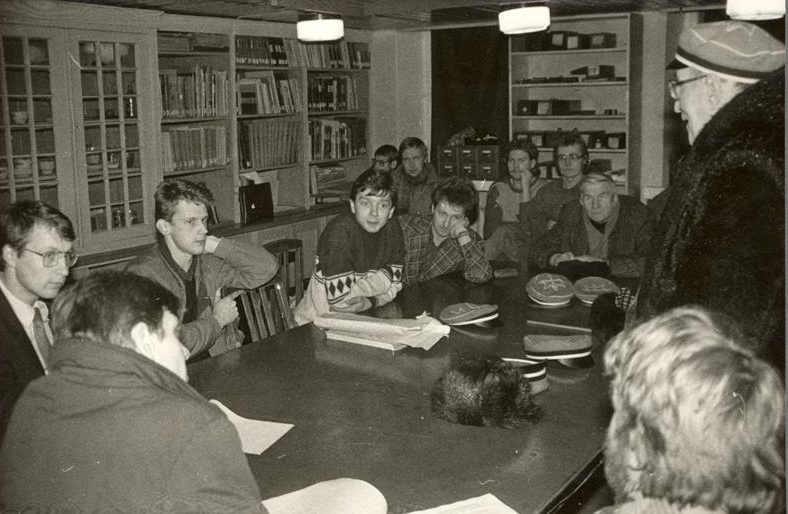 Demokraatia õppetunde saab läbi viia ka siis, kui toad on kütmata. Vilistlane Hillar Randalu õpetab noori kaasvõitlejaid EÜSi raamatukogus 1989. aasta jaanuaris.