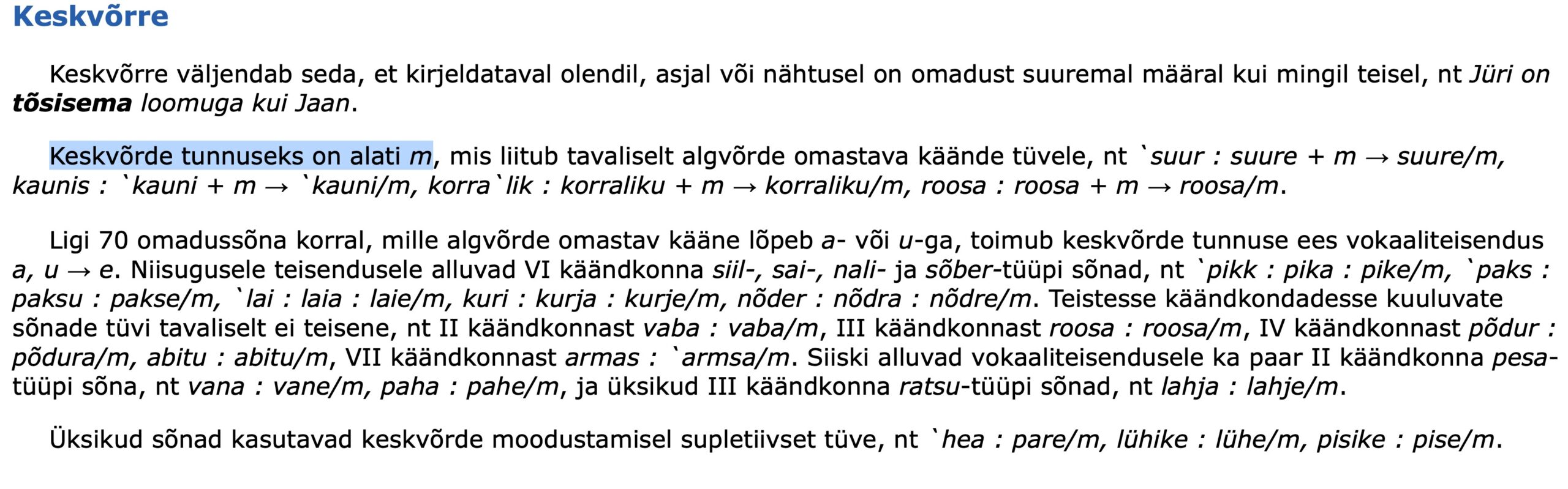 Võrded. Keskvõrret on hakatud üha sagedamini moodustama m-tunnuse asemel määrsõnadega enam ja rohkem. Inglise keeles moodustatakse pikemate sõnade keskvõrre sõna more ‘rohkem, enam’ abil, näiteks more interesting, mille eesti vaste on huvitavam, aga nüüd on üha sagedamini rohkem huvitav, enam huvitav, niisamuti rohkem tähtis, enam kasulik jne. Mõneti võib see olla ka vene mõju (более ‘enam, rohkem’ ja более интересный ‘huvitavam’), sest praegu ei tõrjuta võõrmõjusid enam nii jõudsalt kui Nõukogude ajal ning mõlemad indoeuroopa keeled võimendavad teineteise toimet. Samalaadset inglise keele survet (most ‘enim’) on olnud juba varem tunda ülivõrde puhul, nt kõige uhkema ~ uhkeima asemel enim uhke ning üsna kurioossena kõige vaadatuma ~ vaadatuima filmi asemel kirjasõnas kasutatud kõige enim vaadatud film.2Inglise ja/või vene mõju (less important ja менее важный, sõna-sõnalt ‘vähem tähtis’) on ka määrsõna vähem ülemäärane või asjatu kasutamine, selle asemel et öelda-kirjutada nt pole tähtsusetu ~ on niisama tähtis. Õnneks ei ole veel olnud kuulda-näha võrdlusi vähem suur (s.o väiksem) ja vähem väike (s.o suurem), kuid mine tea – võivad needki tulla, kui kord emakeeletaju on nürinema hakanud. Ja asi ei ole selles, et nii ei ole ilus, vaid karta on, et varsti ei saada enam üksteisest ilma võõrkeele toeta aru. Inglismõjulise keeletajuga kaasvestleja lause „See ei ole enam ohtlik“ ei tähenda rikkumata keeletajuga eestlasele ‘see ei ole ohtlikum’, vaid ‘enne oli ohtlik, nüüd enam ei ole’ (sõnal enam on ka ajatähendus – ja nii mõnelgi selle peamine või koguni ainuke tähendus). Võõrmõjud põhjustavad keele vaesumist ja üheülbalisust, sest aktiivselt peale tungivate vormide tõttu jäetakse emakeele rikkalikud võimalused kõrvale: saab ju öelda või kirjutada veel suurem/lähemal, palju suurem/lähemal, hoopis suurem/lähemal, märksa suurem/lähemal jne. Üha sagedamini rõhutatakse keskvõrret sõna rohkem ja eriti sõna enam abil (enam suurem, enam lähemal jne).