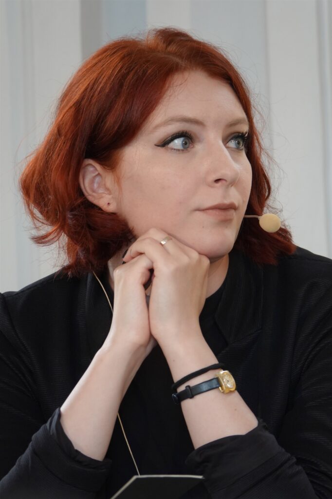 Saksa kirjanik ja kirjandusteadlane Slata Roschal 2022. aastal Erlangeni luulefestivalil romaani „153 mitteolemise vormi“ esitlusel.