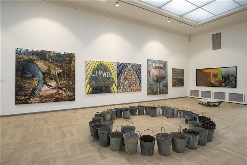 Saali keskel Piret Meose installatsioon „Ämber“ (2017), seinal Kaire Nurga maalid.