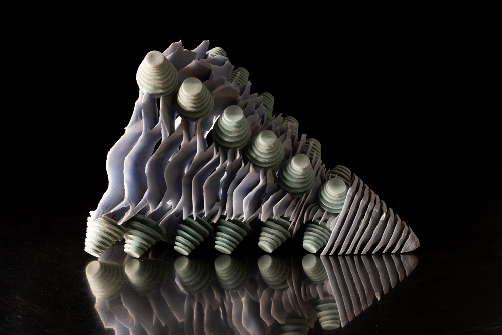 Käesoleva näituse töödes olen mänginud erinevate võnkesagedustega. Paljud võnked ja lained, näiteks heli- või WIFI lained, on silmale nähtamatud. Mina olen võnked toonud nähtavaks klaasi kaudu. Olen saputanud liiva ja peent klaasijahu vaheldumisi vormi. Üks materjal toetab teist. Liiva loomulik valgumine annab kuju klaasi kihtidele. Klaasijahu valgumine omakorda liivakihtidele. Tekib sümbioos kahe loomult küllaltki sarnase materjali vahel. See sümbioos saab lõhutud kui kooslus on kogenud suurt keskkonnamuutust ehk 820 kraadist kuumust. Klaas on sulanud kompaktseks kokku, liiv on aga ikka liiv, see pudeneb klaasikihtide vahelt välja ja jätab enda asemele tühjuse.