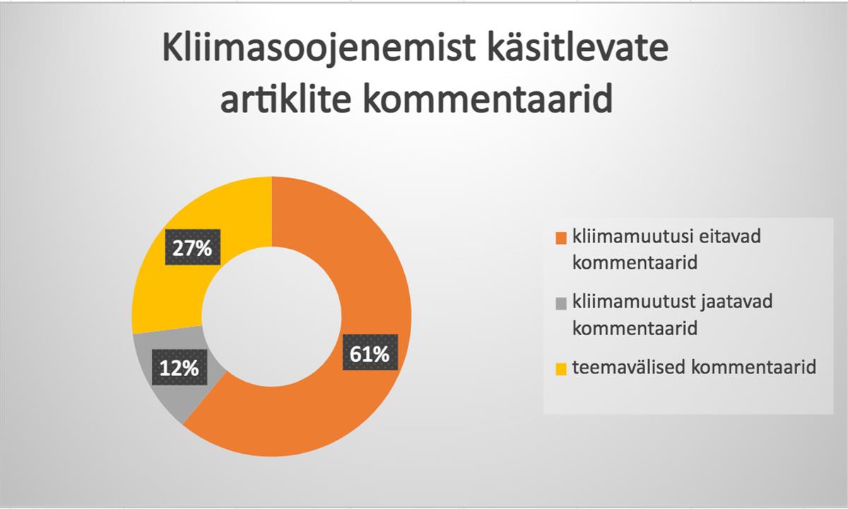 Keskne sõnum, mida kõik väljavalitud lood edastavad, on üheselt mõistetav: 1) kliima soojenemine on reaalsus, 2) see protsess on kahjulik või isegi ohtlik ja 3) see toimub inimese süül. Kommentaare oli kokku 1300. Kõigepealt eraldasin teemavälised ehk seosetud kommentaarid (355) ja kliimamuutust jaatavad kommentaarid (157), kumbagi alamrühmadeks jaotamata. Rohkearvulist ja sisult mitmekesist kliimamuutusi eitavate gruppi esindas 788 kommentaari, mis on 61% kommentaaride üldarvust, ilma teemavälisteta isegi 83%. Need jagunesid seitsmesse alamrühma: kliima on alati muutunud, ilm on kliima, vandenõuteooriate pooldajad, kliima soojenemist põhjustavad alternatiivsed tegurid, soojenemine on kasulik, kohanemisele lootjad ja ükskõiksed.