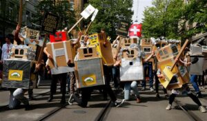 Järgmise paarikümne aasta jooksul automatiseeritakse umbes 50% tööst, mida praegu teevad inimesed. Üks lahendus terendavale tööpuudusele on kodanikupalk. Pildil tingimusteta sissetulekut nõudev protestimarss Zürichis eelmise aasta kevadel enne vastavat rahvahääletust. Šveitslased otsustasid algatust mitte toetada.