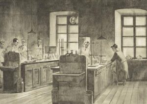 Richard Kaljo. Keemia praktikum Tartu Riiklikus Ülikoolis (Tartu Riikliku Ülikooli Keemiainstituudis). Kuivnõel, paber, 1947. Eesti Kunstimuuseum