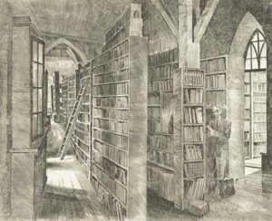 Richard Kaljo. Tartu Riikliku Ülikooli raamatukogus. Ofort, paber, 1947. Eesti Kunstimuuseum