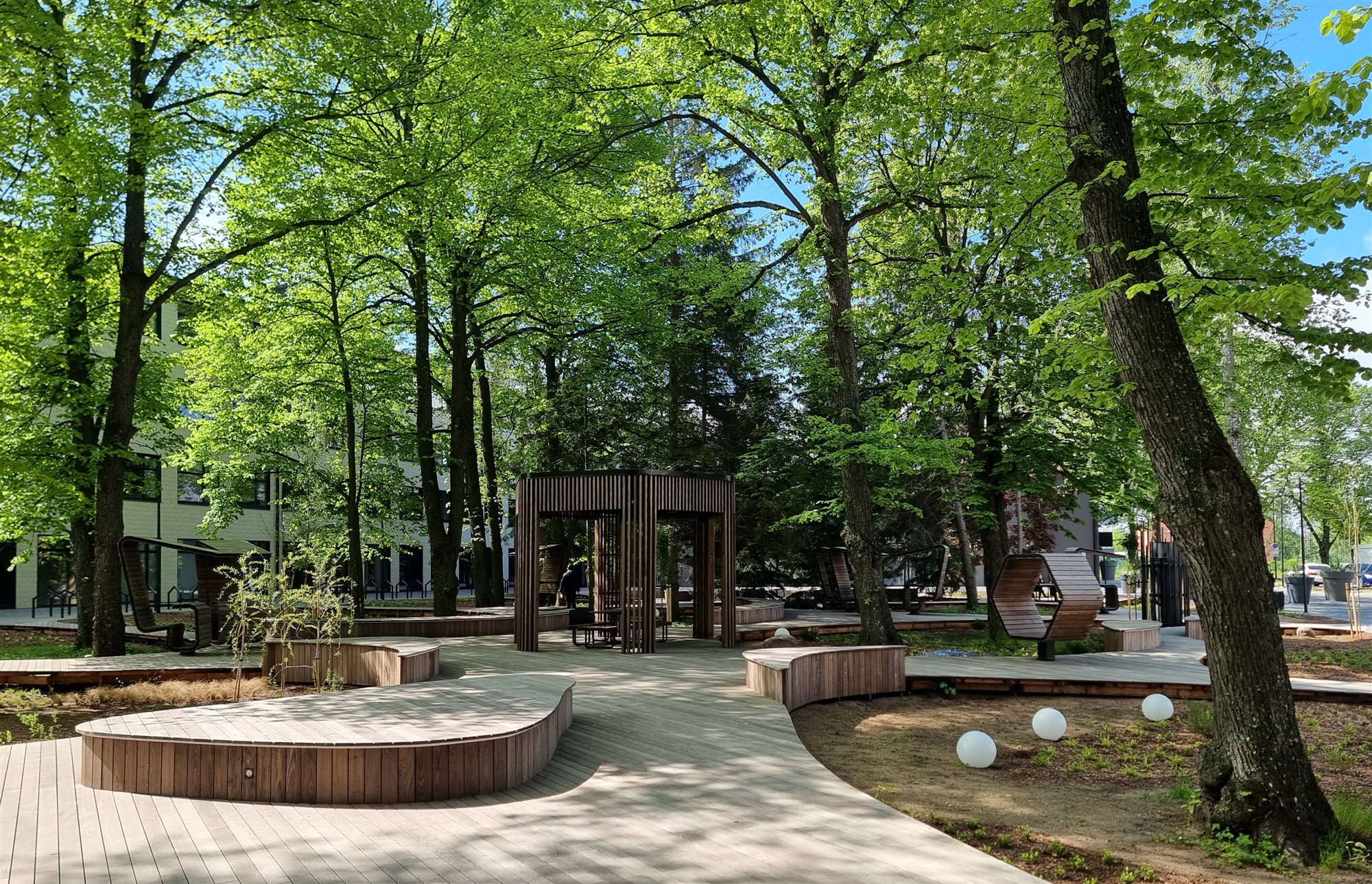 Olla ja hingata. Pargi üldmuljet tugevdab erilahendusena tehtud disainmööbli seeria. Mööbel ei ole siin pelgalt tarbeese, vaid osa ruumikogemusest: sellega on loodud rahulik, tasakaalustatud atmosfäär ning toetatud metsatukamõtet. See on paik, kus saab taastuda linnastressist, istuda, jälgida, olla kohal. Klaasitud aiapaviljonid, nutikalt paigutatud istumiskohad ja kiiged laiendavad paiga kasutusvõimalusi ning teevad pargi atraktiivseks ka neile, kel aega vaid lühikeseks tööpausiks, või ka juhuslikule möödujale.