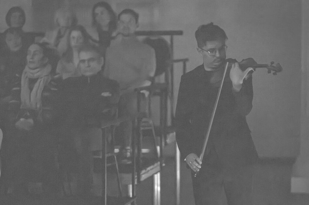 Solist Robert Traksmann alustas Pēteris Vasksi viiulikontserdi „Kauge valgus“ mängu publiku selja tagant, liikudes muusika saatel lava poole.