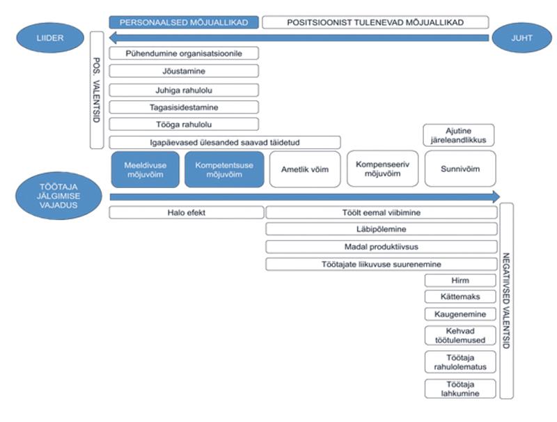 Mõjuvõimu allikaid (kirjeldatud skeemil) on kahte tüüpi, millest üks peegeldab juhti kui isiksust (personaalsed mõjuallikad) ja teine juhti kui ameti kandjat ehk positsioonist lähtuvat mõjuvõimu. Personaalsete mõjuallikate hulka kuuluvad kompetentsuse (tugineb usule, et mõjutajal on vajalikud teadmised ja oskused) ning meeldivuse (samastumine mõjutajaga või soov olla tema moodi) mõjuvõim. Ametist tulenevalt saab juht ametliku võimu (teda on ametikohale määratud või valitud) ja/või võimaluse rakendada sunnivõimu (võimekus näidata seost käitumise ja ebasoovitava tulemi vahel) ning ka kompenseerivat mõjuvõimu (võimekus näidata seost käitumise ja soovitava tulemi vahel).