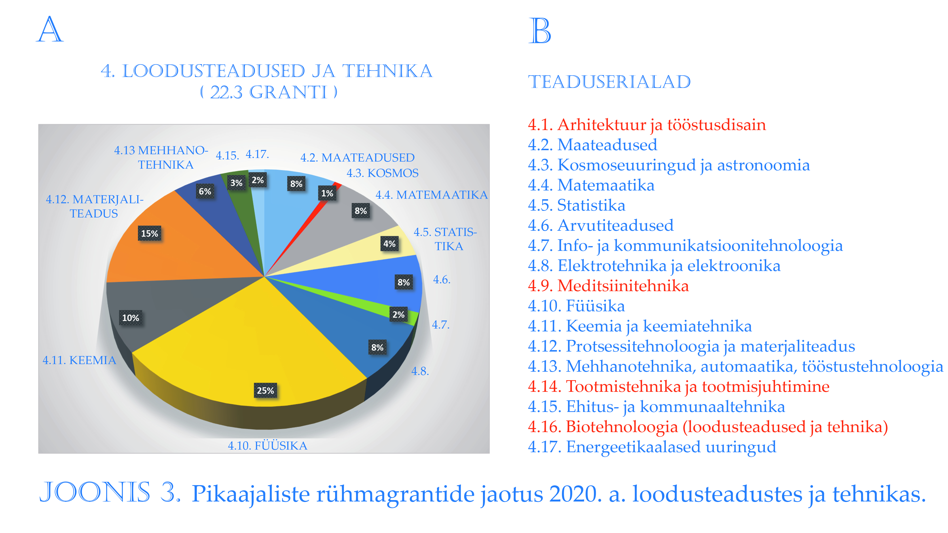 Kolmandaks kõige esinduslikum loodusteaduste ja tehnika valdkond, mis sai kokku ligi 23 granti. Taas on valdkonna teadusharude täielikus loendis märgitud punasega valdkonnad, mida eelmisel aastal pikaajaliste rühmagrantidega ei finantseeritud.