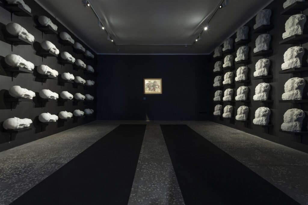 Põnev on tõsiasi, et mõlemad näitusele jõudnud skulptuurid pole terviklikud. Wiiralti „Kristjan Tedre portree“ elas üle Tartu pommitamise ja tõmmati välja Pallase rusudest. Algselt täisformaadis (s.t õlgadega) portreebüst on meieni jõudnud haavatuna – seetõttu on intensiivne üldistus, mille vaimus Wiiralt Tedre pea on lahendanud, ainult tugevnenud. Kaselaane „Inimese pea“ pole tegelikult mõeldud eksponeerimiseks üksiku skulptuurina, vaid rühmana. Tegu on arheoloogiliste väljakaevamiste käigus leitud rohmaka inimpea (julgen arvata, et lõpetamata töö) kipskoopiate massiiviga, koguarv peaks olema saja pea ringis. Ehk siis ühelt poolt näeb näitusel teost, mis on umbkaudu kolmandiku oma mateeriast kaotanud, teiselt poolt teost, mille tervikmahust ongi eksponeeritud umbkaudu kolmandik. Arvestades mõlema teose jõudu ja selle fookustatust näitusel, on tragikoomiline, et mõlema näol on tegu sandiga.