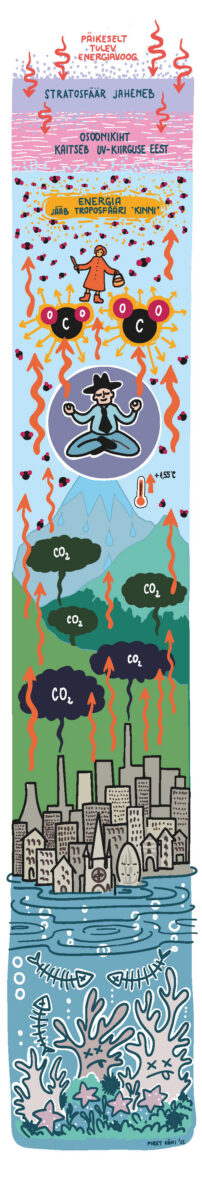 Teine fakt näitab, et atmosfääri CO2 sisaldus tõuseb pidevalt ja kiiresti. NOAA Mauna Loa vaatlusjaama andmetel oli 2024. aasta keskmine CO2 sisaldus 424,61 ppm (osakest miljoni osakese kohta) ja 2025. aasta keskmine 427,35 ppm.4 400 ppm piiri ületasime vaid 10 aastat tagasi, 2015. aastal. Vahel kasutatakse vastuargumendina, et CO2 sisaldus atmosfääris on nii madal (~0,04%), et see ei saaks temperatuuri tõusu põhjuseks olla. Tegelikult pole tähtis sisaldus, vaid toime. Osooni osakaal on atmosfääris veel suurusjärke väiksem (~0,00006%), kuid selleta praegusel kujul elu Maal ei oleks – just see väike kogus neelab Päikeselt tulevat UV-kiirgust.
