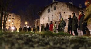 Rimini Protokolli lavastuses „Kauge X“ („Remote X“) juhib osalejaid läbi linna kõnesüntesaatori hääl kõrvaklappides. Pildil etendus festivalil „Talveöö unenägu“ 2014. aastal.