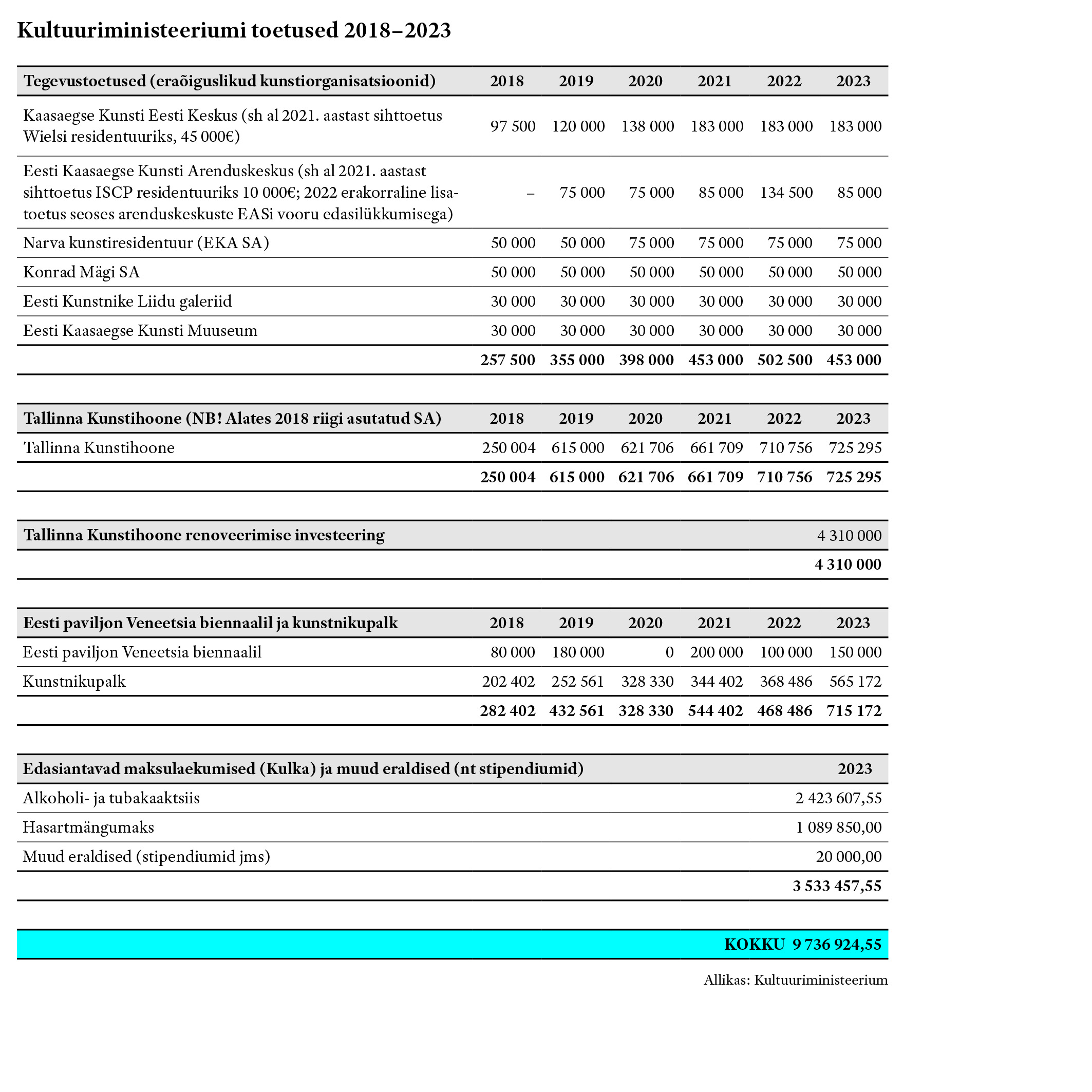 Kui lahutada 9,7 miljonist Tallinna Kunstihoone investeering ja kulkale edasikantavate maksudena minev osa ehk ligi 3,5 miljonit, jääb alles 1,9 miljonit. Selle sisse mahuvad sel aastal märkimisväärselt tõusnud kunstnikupalgad (ca 550 000), osalemine Veneetsia biennaalil (150 000), aga ka kunstiorganisatsioonide tegevustoetused (kokku ca 1,2 miljonit). Tegevustoetuste real paistab hea näitena silma riigi sihtasutusena tegutsev Tallinna Kunstihoone, mille ca 725 000 euro suurune toetus moodustab üle 60% kogu „potist“.