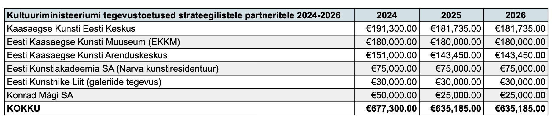 6 Kunstiasutuste Liit: Ettepanek kunstiasutuste tegevustoetuste süsteemi parandamiseks (2025), lk 12-13. https://www.kael.ee/wp-content/uploads/2025/08/KAEL_tegevustoetuste-ettepanek.pdf