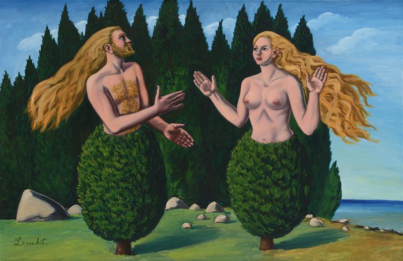 Aga inimeses on peidus ka taim. Kõige paremini näitab seda „Keskustelu“, mis on esimest korda maalitud 1988, teist korda aga aasta hiljem, 1989-1990. Näeme palja ülakehaga meest ja naist, kes ilmekalt žestikuleerivad, nähtavasti elava vestluse käigus. Tegelikult on need kaks kadakapõõsast, kes seisavad kõrvuti mererannal. Vöökohast allapoole näeme ainult kadakaokkaid ning jalgade asemel on mõlemal tüvi. Varasemal maalil on ülakehad rohekashallid, sulades taustaga ühte, samuti nagu Kalevipoeg pildil „Kalevipoeg ja saareneiu“ (1987); hilisemal maalil on aga ülakehad ihukarva rõõsad (nagu võrgutava moega saareneiu), ja see annab pildile kerge erootilise võbeluse. Ka vestlejate juuksed on hilisemal pildil muutunud rohekashallist kuldseks ning mehele on ilmunud kullakarva habe ja rinnakarvad; meri on seevastu rahulikum, teiste kadakate ladvad ei paindu tuule käes ja juuksed helendavad mahedas õhtuvalguses.