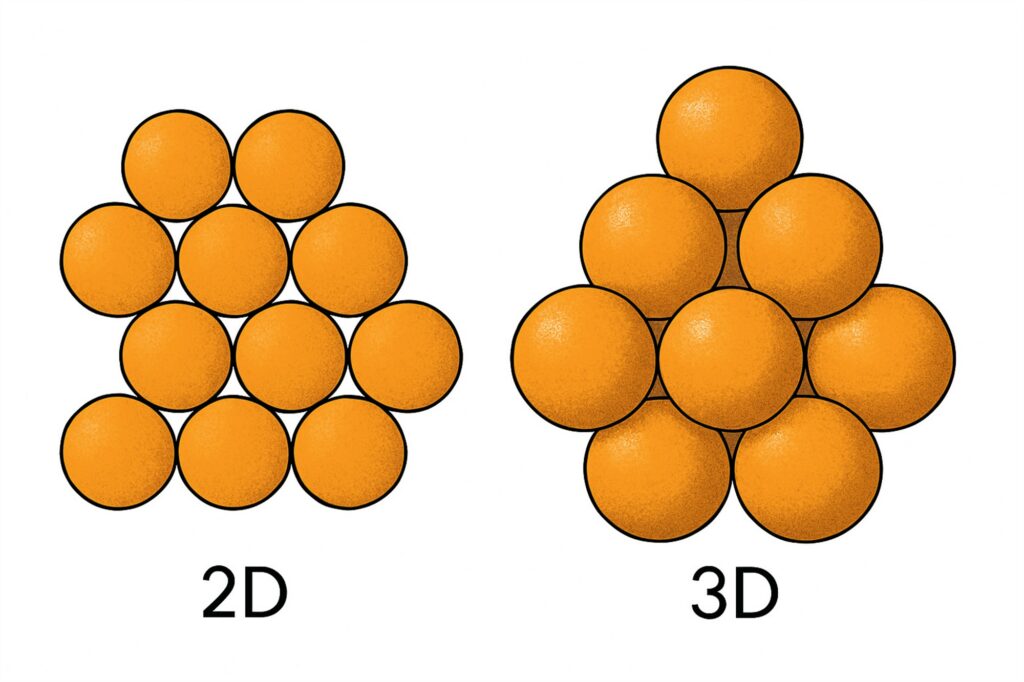 Joonis 1. Illustratsioon kuulikeste optimaalsest paigutusest kahes mõõtmes ja kolmes mõõtmes – kusjuures kolmes mõõtmes leidub veel teinegi võimalik optimaalne paigutus.