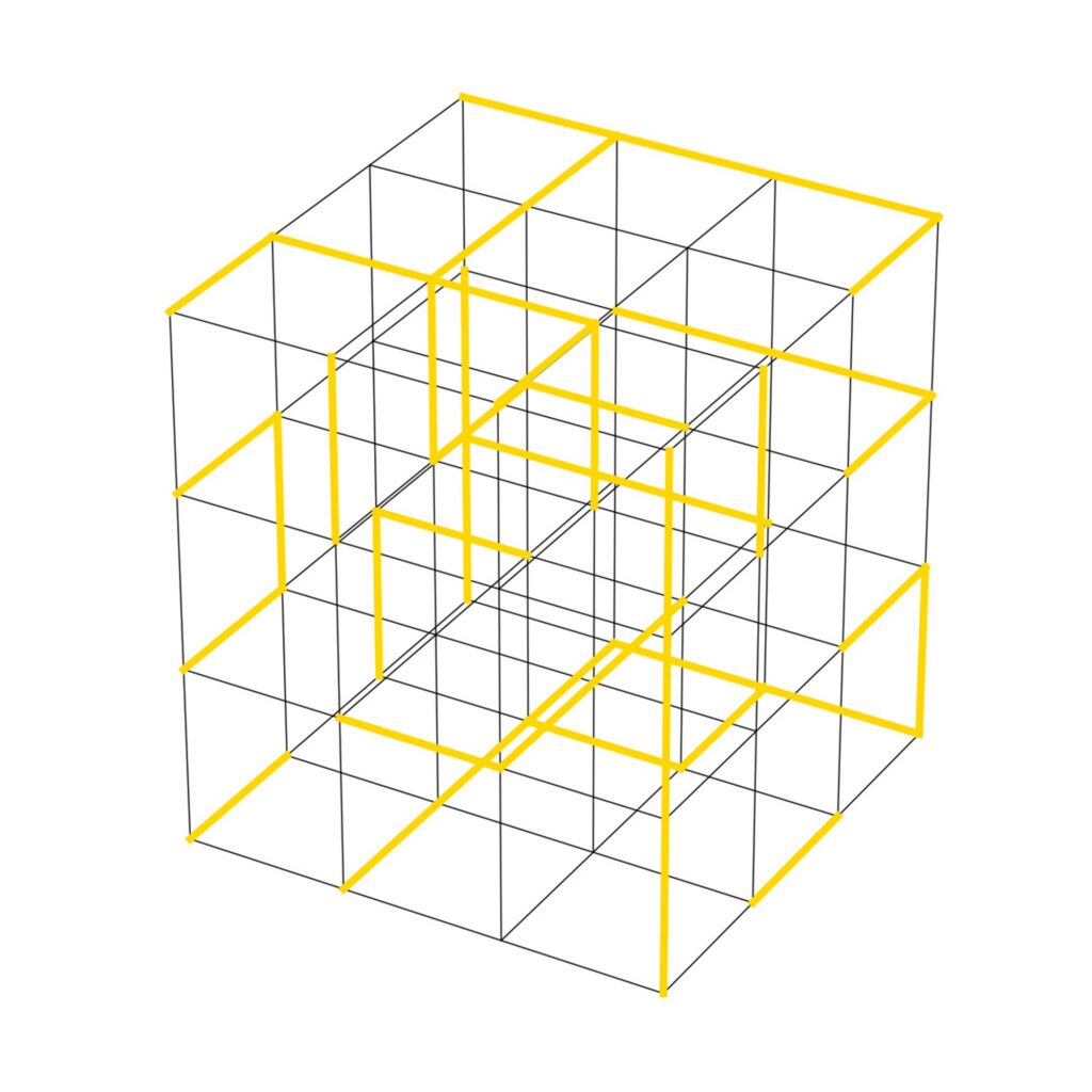 Joonis 2. Perkolatsioon kolmemõõtmelisel võrel, avatud poorid on värvitud kollaseks.