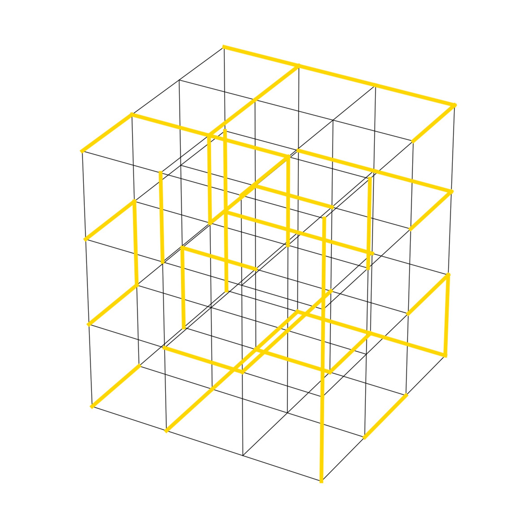 Joonis 2. Perkolatsioon kolmemõõtmelisel võrel, avatud poorid on värvitud kollaseks.
