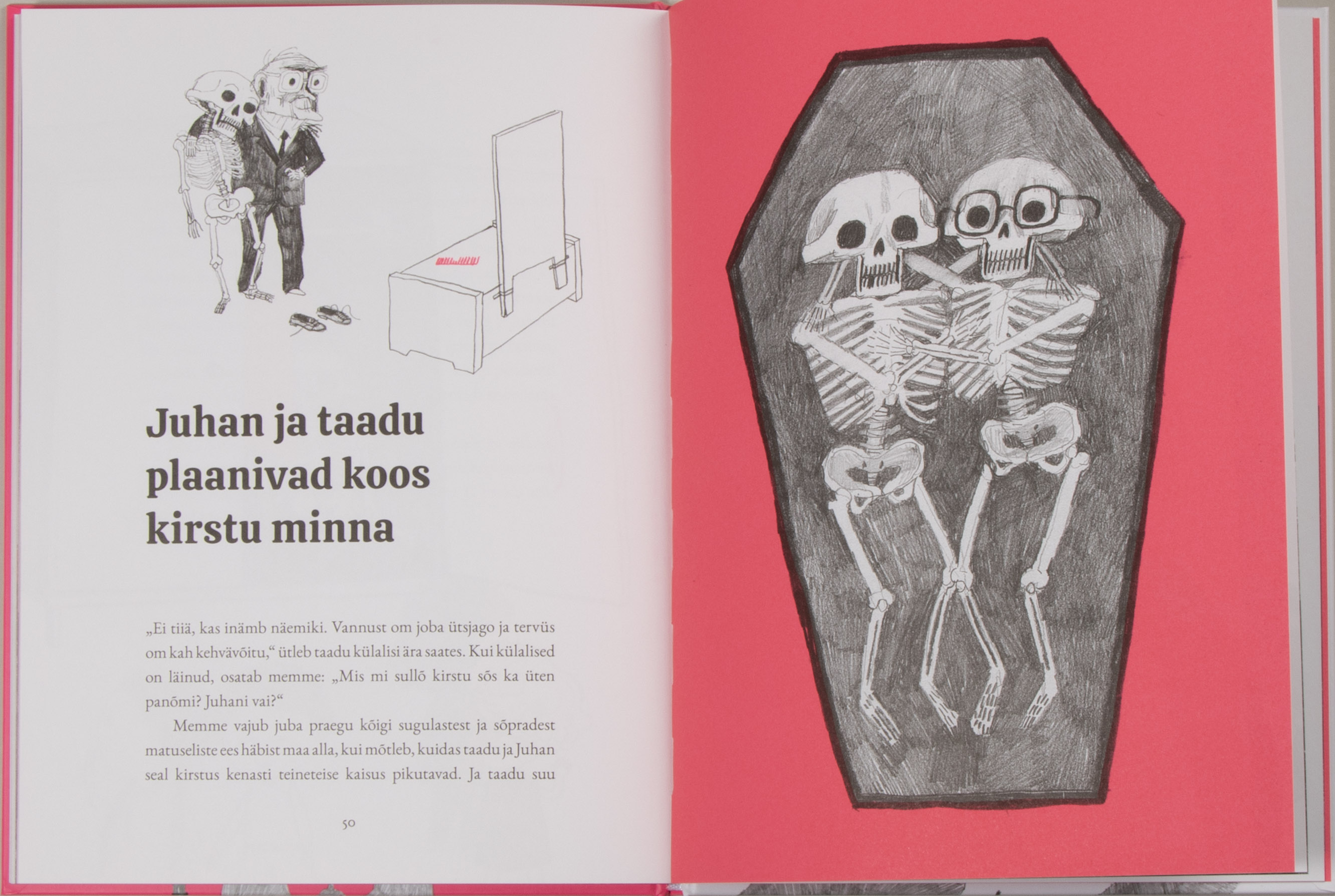Hoopis mängulisemat värvikasutust on pakkunud Marja-Liisa Platsi illustreeritud Triinu Laane lasteraamat „Luukere Juhani juhtumised“. Surmapositiivne teos väikesele lugejale, kus avatakse eksistentsiaalseid teemasid musta huumori võtmes. Mustvalgetele pliiatsijoonistustele on lisatud kamaluga kärtsroosat. Tulemus on ootamatu, meeldejääv ja ligitõmbav. On raske välja mõelda elusamat tooni kui küünelakilik neoon, mida surelikkusest pajatavale teosele aktsendiks lisada.