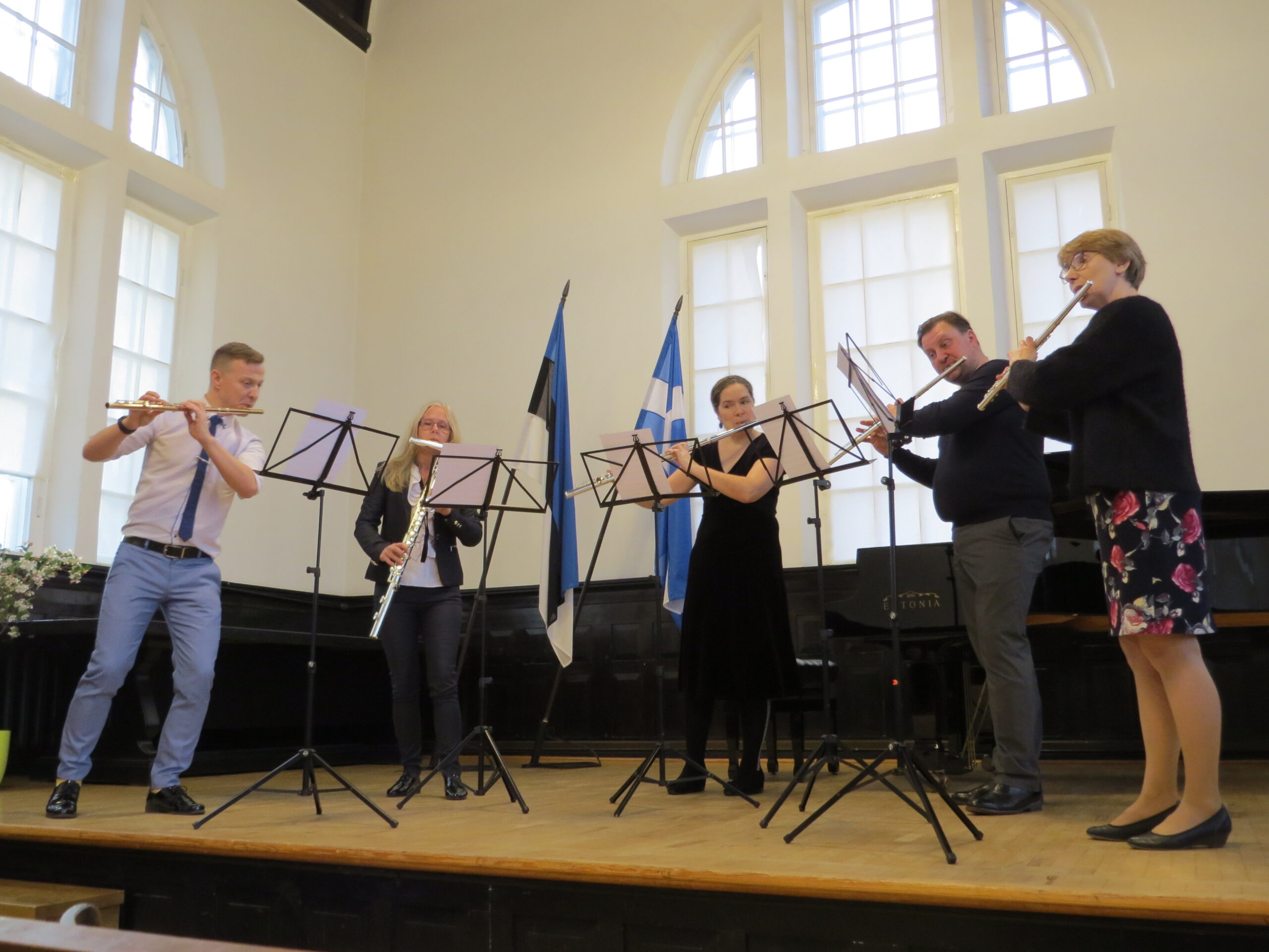 Fotojäädvustus tänavusele suurele juubelikontserdile eelnenud puhkpilliosakonna juubelikontserdilt 11. jaanuaril 2020 Pärnu Raekojas. Pildidl (vasakult) flötistid Hardo Killing, Anne Kann, Leonora Palu, Andres Maamees ja kooli direktor Mall Türk. Foto kooli erakogust. Sel laupäeval toimuvale suurele juubelikontserdile eelnes 5 osakondade kontserti.