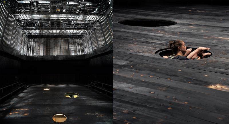 Jaotasin black box’i kaheks: maapealseks ja lavaaluseks ruumiks. Maapealne osa, kus asetseb ka publik, on must põletatud ruum, mille põrandas on kolm auku. Maa-alune, mida publik näeb vaid põgusalt läbi aukude, on vastandina mustale ruumile realistlik ja valgusküllane elutuba. See osa kujundusest esindab argipäeva müra ja kõike, mis on teatraalne, võlts, pealispindne. Sestap olen peitnud selle ka täielikult lava alla.