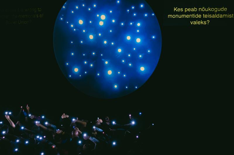 Kellele uudis, kellele mitte, aga enim järelemõtlemist pakkus anonüümse vastamise voor, s.t kui laval kustutatakse tuli ning jah-vastuse puhul tuleb laval olijal vaid taskulambiga märku anda. Kes on vältinud riigimakse? Kes on kogenud koduvägivalda? Seejärel süttivad taskulambitähed pea kogu ekraanil: saame teada, et valitsus diskrimineerib vene kultuuri, et Nõukogude monumentide teisaldamine on vale („Jätke rahule ajalugu ja kõik, mis on seotud Venemaa endiste võitudega“ – 42aastane naine kavaraamatus.) ning et enamik kardab tõsiseid tagajärgi, kui avaldab kõigi kuuldes oma arvamust. Kas vaatate keelatud Vene telekanaleid? Valgusmeri süttib ning publikust kostab entusiastlik plaksutamine.