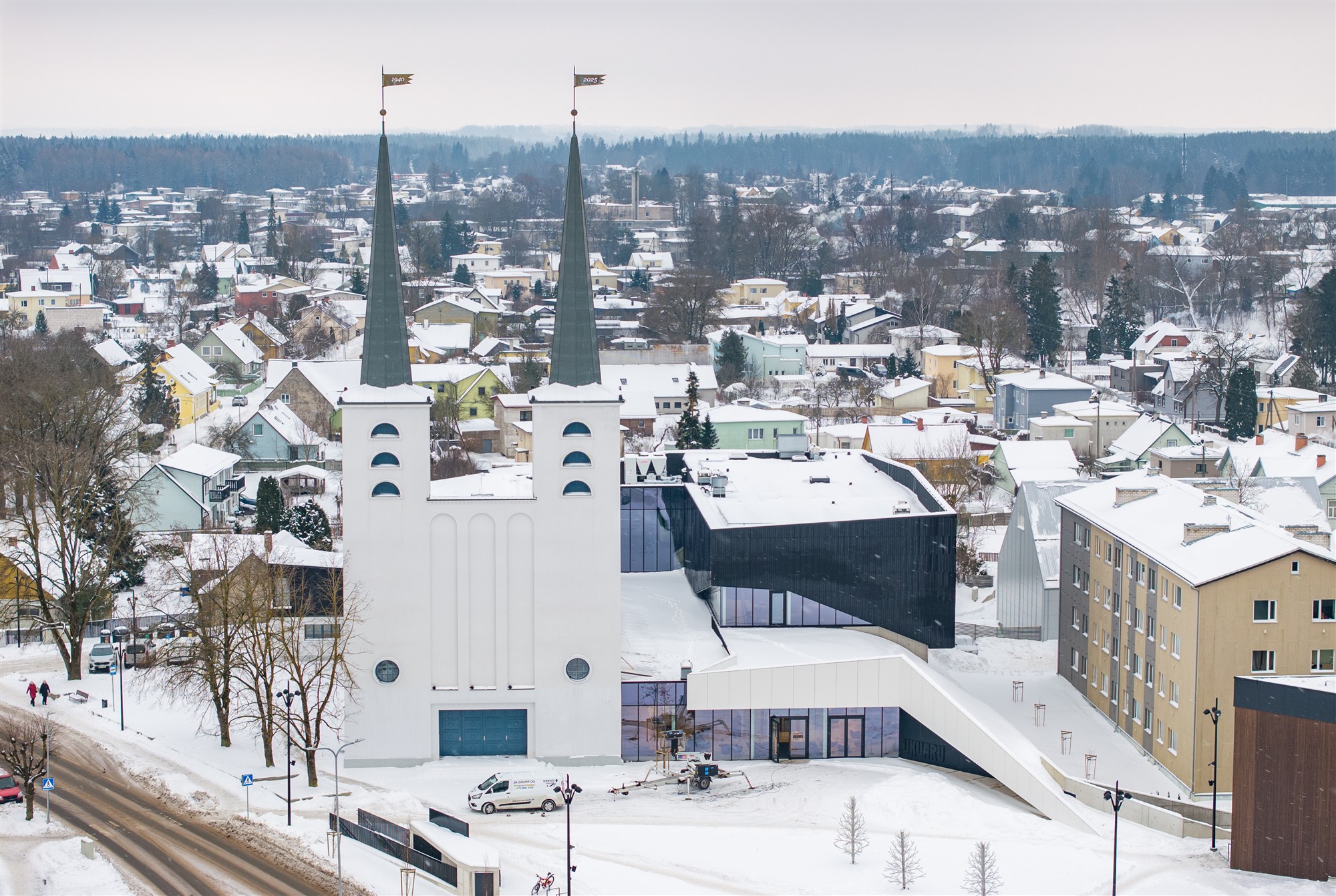 Linnasiluetti tekkisid uued maamärgid – kahekesi koos ja ühtemoodi. Need on kirikutornid, mis projekteeriti Alar Kotli visandatud eskiiside järgi. Ühe torni lipu peal on aastaarv 1940 ning teisel 2025 – sümboolsed verstapostid tulevastele põlvedele.