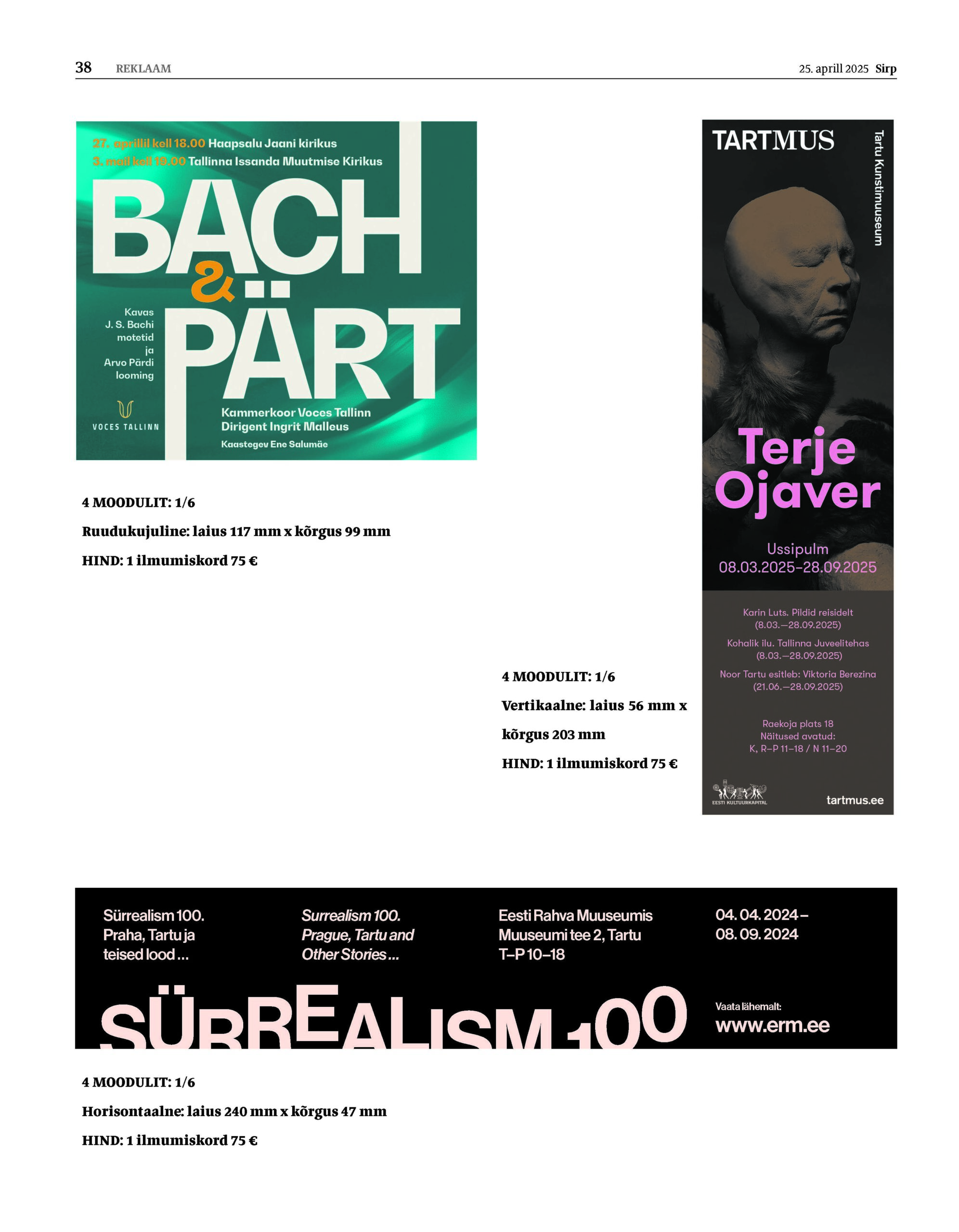 Valmis reklaami palume esitada teisipäeval kella 15ks, sest Sirp trükitakse kolmapäeviti.