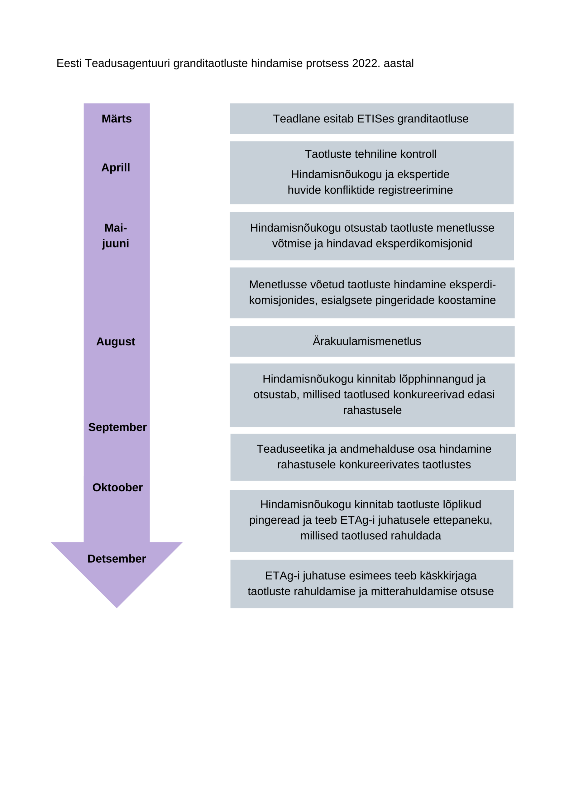 Pikalt oodatud muudatus on sel aastal taotluste hindamine rahvusvahelistes eksperdikomisjonides (nn paneelides). Seni hindasid granditaotlusi ETISe vahendusel välisretsensendid, kes eesti teadlastest koosnevate eksperdikomisjonidega taotlusi ei arutanud. Alates sellest aastast on välisretsensendid ühtlasi ka eksperdikomisjonide liikmed, hinnanguid arutatakse ühiselt komisjoni koosolekutel hindamisskaalade ühtlustamiseks ning pingeridade koostamiseks. See tähendab, et taotleja ei saa oma taotlusele enam mitut retsensiooni, vaid ainult ühe koondhinnangu. Kokku moodustatakse stardi- ja rühmagranditaotluste hindamiseks (senise seitsme asemel) 17 rahvusvahelist eksperdikomisjoni.12 Järeldoktorigrandi taotlusi hakkab hindama eraldi eesti teadlastest koosnev eksperdikomisjon, kuivõrd selle granditüübi puhul on suurem rõhk projektide olulisusel Eestile teadlaste järelkasvu tagamise aspektist. Teadusliku hindamise järel rahastusele konkureerima pääsenud taotlustes teaduseetika ja andmehalduse osa hakkab samuti hindama eraldi komisjon, kuhu kuuluvad vastavate valdkondade asjatundjad.
