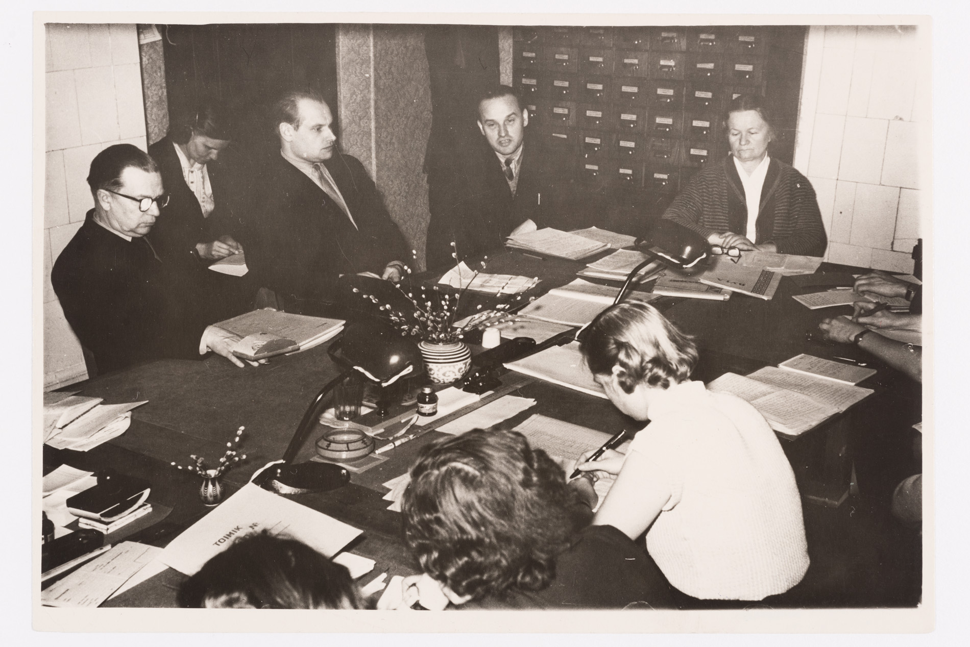 Etnograafiamuuseumi teadusliku osakonna koosolek märtsis 1959. Vasakult Harri Moora, Tiina Võti, Aleksei Peterson, Ants Viires, Aliise Moora.