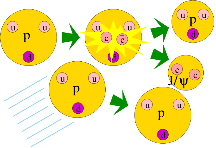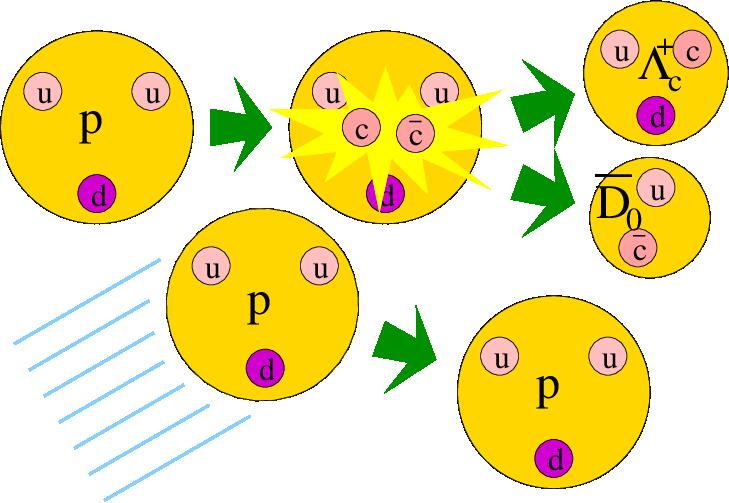 Joonis 1. Lahtise sarmiga osakeste tekkemehhanism. Ülemise rea prooton on märklauas paigas ja selles tekib spontaanselt sarm-antisarmi paar. Alumise rea prooton tuleb kiirendis ja põrkub esimese prootoniga elastselt kokku. Põrke tulemusena tekivad protsessis barüon Λ+c ja meson
