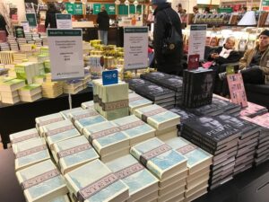 Finlandia auhinnale kandideerivaid raamatuid ei ole võimalik mitte märgata. Pildil väljapanek Helsingi Akadeemilises Raamatukaupluses.