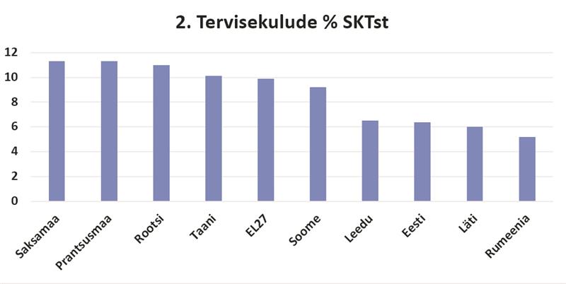 Ostujõu pariteeti arvesse võttes kulutame Eestis inimese kohta tervishoiule Soomest 1,5 korda, Rootsist ja Taanist üle 2 korra ning Norrast ja Saksamaast 2,5 korda vähem. Ennekõike olemegi nöörinud inimesi, kes ei ole aga kurvastuseks astunud oma kutse-eetikast ettekäändeid ammutades piisavalt mõjuvaid samme olukorra muutmiseks. Arvnäitajaid, mida kasutada võitluses oma huvide kaitseks, vedeleb ju kuhjas maas. Kui soovida Euroopa keskmisel või Põhjamaade tasemel raviteenust, peaks haigekassa eelarve püsituludeks lisama praeguste kaitsekulude kahe protsendi jagu kahekordselt (joonis 2). Meedikutel tasuks eeskuju võtta teadlastest, kelle pikaajaline mõjutusplaan praeguseks on tulemuseni viinud ja soovitud miinimum protsendina SKTst järgmiseks aastaks käes.