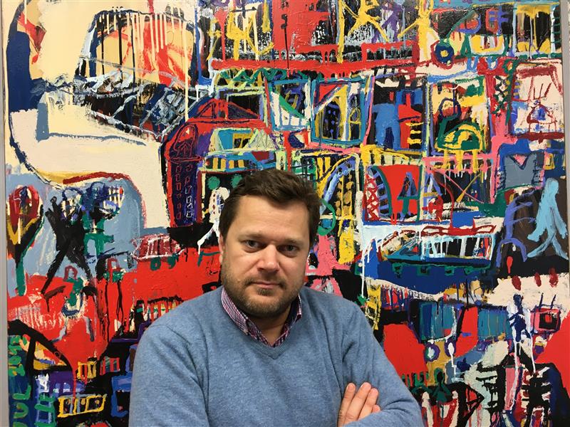 Kunstikoguja Reigo Kuivjõgi, taustal Alar Tuule maal „Meedik“ (2013) tema kogust.