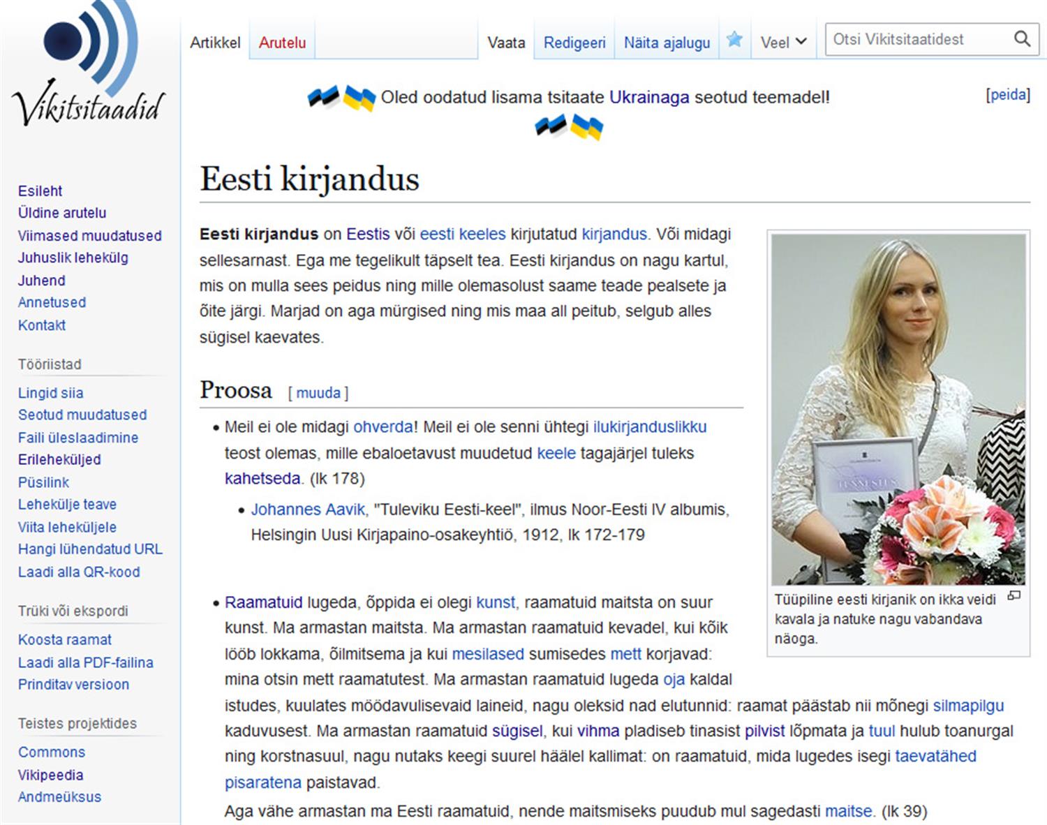 Vikitsitaatide projekt kui niisugune on Vikipeedia sõsaratest üks vanimaid, inglise keeles pandi sellele alus 2003. aastal. Toona vikiprojektidele suurt edu ei ennustatud, mistõttu on kõigile keeleversioonidele ühiseid reegleid vähe. Eesti Vikitsitaatides on tasakaalustatud meeshäälte domineerimist ning kultuuri digimisel tüüpilist kaanoni ülevõimendamist. (Kas raamatuaasta lõpul on meil sada uut veebilehte Tammsaare ja null Minni Nurme kohta?) Praegu on tegu keeleversioonide seas artiklite arvult (üle 13 000) maailmas kuuendal kohal projektiga, milles isikuartikleid on naiste kohta napilt rohkem kui meeste puhul ning kus on muuhulgas ka eestindatud arvukalt autoreid, kelle tekste eesti keeles varem ilmunud pole (uue tõlke autor lisab sellekohase märkuse). Vahel saab päris tavatud asjad väga väheste inimestega ära teha, kui olla järjekindel ja jonnakas. See on muidugi omane vikipedistidele, aga ka eestlastele.