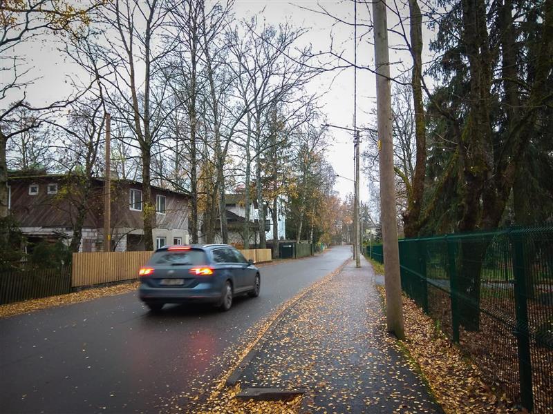 Alustanud teekonda Raja tänavalt, märkan rahustatud liiklust, mis on saavutatud kõrgendatud teeosadega. Sellegipoolest on kiirendamist nende vahel omajagu, kuigi piirkiiruseks on sätestatud 30 km/h. Piisava laiuse ja sileda kattega kõnnitee asub vaid tänava ühel poolel ja on tihti katkestatud täpselt keskel paiknevate valgustuspostidega. Kuigi kõnnitee laius on umbes 1,8 meetrit, on liikumisruumi takistuste tõttu vähe. Jalakäija peab peale postide vahel laveerimise jälgima hoolikalt teekatet, kuna kanalisatsioonikaevude tõttu on kõnniteel järske sisselõikeid. Eriti ebameeldiv on see siis, kui jalakäijad kohtuvad ja tekib segadustants, kes kummalt poolt posti möödub ning kes korraks autoteele või kanalisatsiooniluugile hüppab. Probleemiks on ka kõnniteeta tänavapoolel parkivad autod, mis vähendavad ohutuks liiklemiseks tarvilikku ruumi ja sunnivad jalgratturid teeserva blokeeringute tõttu kõnniteele.