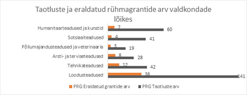 Sotsiaalteadustest esitati stardigrantide taotlusvoorus 18 avaldust, rahastuse sai vaid 6% ehk üks, tehnikateadustes esitati 15 avaldust, rahastuse sai 40% ehk kuus (vt joonis 1).3 Humanitaar- ja sotsiaalteaduste valdkondadest taotlejad olid kõige vähem edukad, ent see ei tähenda, et teadlased või nende projektid oleksid ebaedukad, pigem näitab see teaduspoliitika puudusi. Kui HTM annab mõista, et ohus on teaduse valdkondlik mitmekesisus, siis miks suretatakse järjepidevalt mõningaid valdkondi välja? Nii humanitaar- kui ka sotsiaalteadustes on valdkondi, nt majandusteadus, politoloogia, mis on loodud või suuresti ümber struktureeritud pärast taasiseseisvumist. Kummaline, et need ei ole enam riigile prioriteetsed valdkonnad, kuigi just need aitaksid mõista ühiskonnas toimuvat. Sotsiaalteadustes annab stardigrandi 6%-line edu noortele märku, et siin valdkonnas ei ole mõistlik teadlaskarjääri alustada. Seega on lootus, et personaalsete uurimisgrantidega „suureneb teadlaskarjääri atraktiivsus“, samuti läbi kukkunud. Mida suurem on teadusrahastuse konkurents olukorras, kus teadusrahastust ei ole suurendatud ning see suunatakse eeskätt valitud „silotornidesse“, seda vähem meelitab teadlaskarjäär. Tööd saanud teadlased püüavad kuidagi ellu jääda, noored tulijad eelistavad muid karjäärivõimalusi. Ühiskonna ja teaduse silmis suurendab teadlaskarjääri atraktiivsust põletavate probleemide uurimine, mitte nende probleemide uurimiseks vajaliku palgaraha pärast kaevikusõja pidamine.