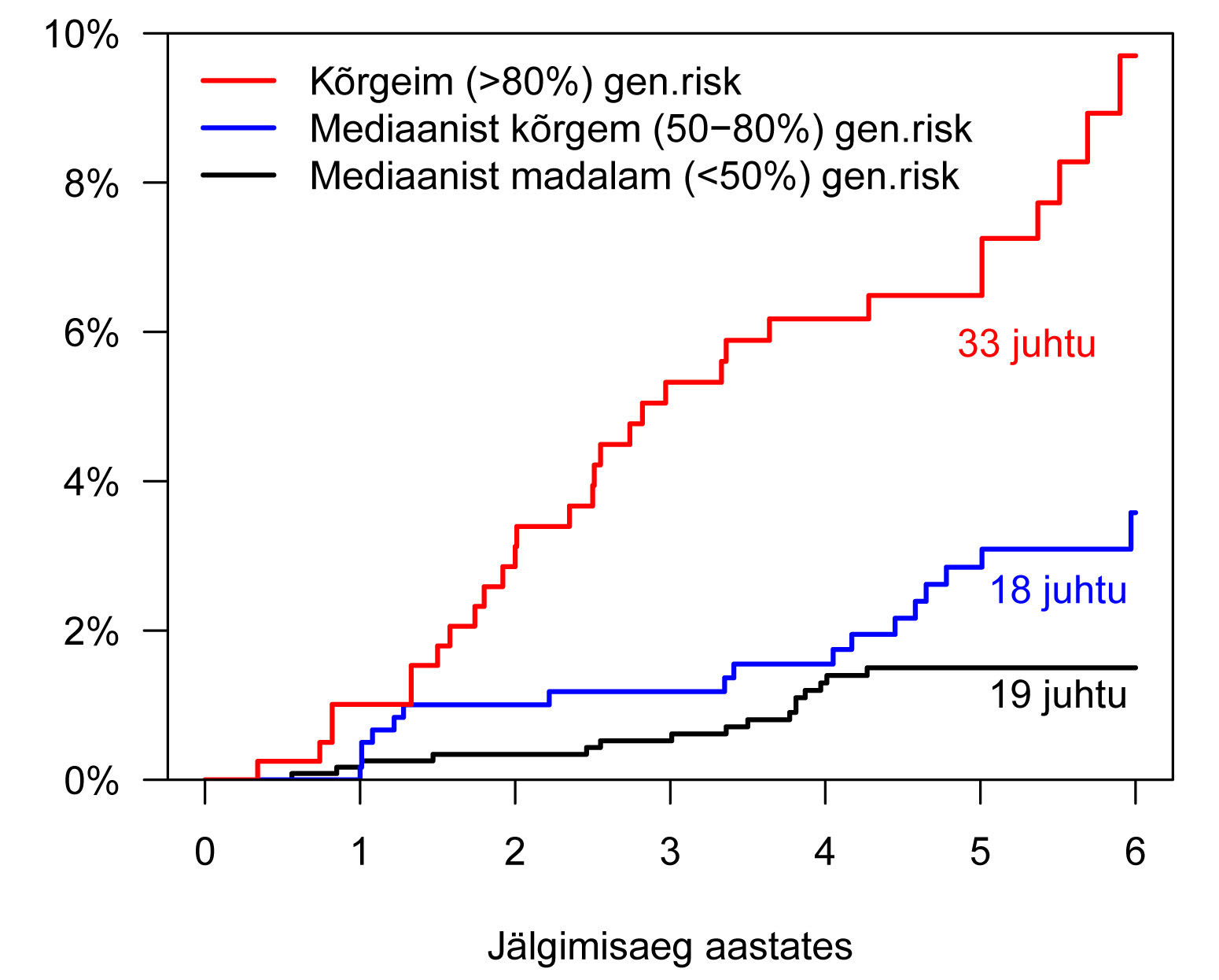 Joonisel 2 on toodud mediaanist madalama (< 50%), mediaanist kõrgema (50–80%) ja 20% kõrgeima geneetilise riskiga meeste kumulatiivne risk haigestuda ning näha on pärast geenivaramuga liitumist lisandunud südamelihase infarkti diagnooside arv igas grupis. Lühikesest jälgimisajast hoolimata on kõrgeim