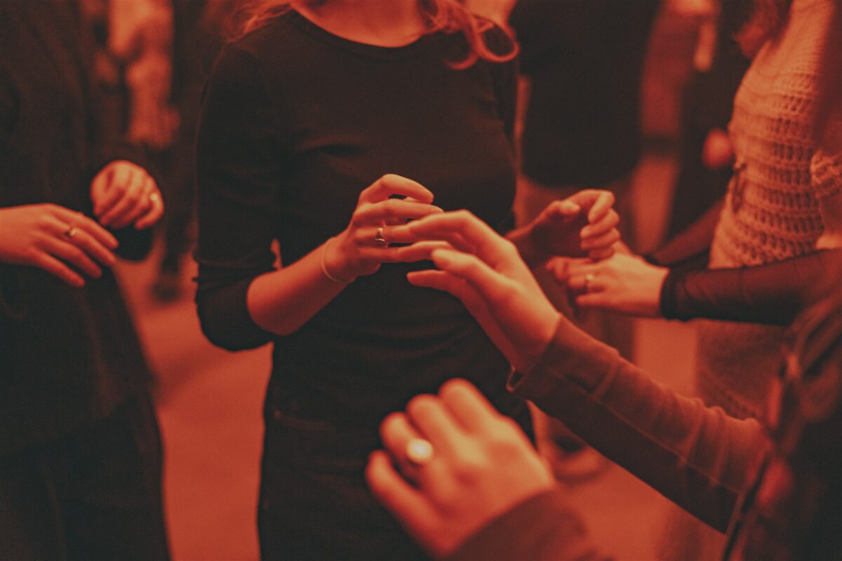Etenduse jooksul antakse kätele mitmesuguseid ülesandeid, mis eeldavad teise inimesega kontakti astumist. Kuivõrd pimesi võib kaaslase leidmine osutuda keeruliseks ülesandeks, siis siinkohal abistavad osalejaid üleloomulikud olendid: ühtäkki tundsin oma õlgadel kellegi sõrmi, mis suunasid mind ruumis edasi ja kohtuma tundmatu paarilise kätega. Kui kõrvaklappides räägitakse midagi peegelpildi kallistamisest, embame üksteist kohmetult ega saagi aru, kas tegelikult pidime ja kui kaua peaksime üksteisel veel kätest kinni hoidma. Ühe inimese kätega sain etenduse vältel veidi lähemalt tuttavaks ning mõistsin järsku, kui palju informatsiooni need tegelikult edastavad: aiman ainuüksi puudutuse abil selle inimese sugu, vanust, perekonnaseisu ning võib-olla isegi nahahooldusharjumusi. Siiski tundsin samal ajal ka teatavat kõhedust, sest sedasama uuris ju tema ka minu käsi puudutades. Miskit oli selles kontaktis ääretult ilusat ja kordumatut, veidi intiimsetki, seda enam et usaldasime teineteisele ka oma eesnime.